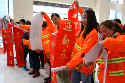 “春滿人間百花吐艷 福臨小院四季常安” “一帆風(fēng)順年年好 萬(wàn)事如意步步高” ……1月26日至28日,麗匯大廈一樓熱鬧非凡,為了感激社會(huì)各界對(duì)綠港集團(tuán)的關(guān)心與支持,由綠港集團(tuán)工會(huì)組織的書(shū)法家“迎新春 送祝?!绷x務(wù)送春聯(lián)活動(dòng)吸引了大量前來(lái)求墨寶的社會(huì)各界人士。三位南寧市書(shū)法協(xié)會(huì)的書(shū)法家以及南寧科巨公司副總經(jīng)理陸章發(fā)為觀眾們現(xiàn)場(chǎng)揮毫,一幅幅金燙燙、散發(fā)著墨香的春聯(lián)映襯著人們的笑臉,整個(gè)現(xiàn)場(chǎng)彌漫著濃濃的年味,短短三天時(shí)間便送出了2000多副春聯(lián)。1月26日上午,綠港集團(tuán)工會(huì)還啟動(dòng)了派送春聯(lián)儀式,綠港集團(tuán)工會(huì)主席黃麗琴帶領(lǐng)工會(huì)人員將春聯(lián)送到經(jīng)開(kāi)區(qū)40余位保潔人員、園林綠化工人、公司職工的手上。(張彩秀/文、圖)