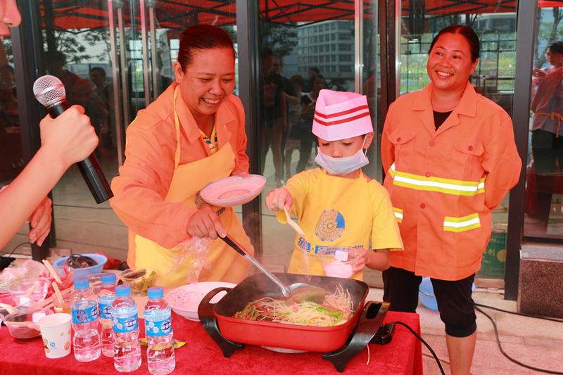 搶答活動結束之后,進入“小廚神”廚藝大比拼環(huán)節(jié)。由園林綠化工人、水電維修物業(yè)工人、保潔人員等進城務工人員組成的5組家庭展開了激烈的廚藝大比拼競賽。看,小廚神們在父母的指導下井井有條地備菜、炒菜、起鍋,忙得不亦樂乎。各色菜式色香味俱全,充分展現(xiàn)了孩子們“小當家”的本領。半小時后,小廚神們在大家的熱烈掌聲中完成了比賽菜品,廚藝大師及現(xiàn)場觀眾根據(jù)完成的速度、菜品、味道等評出廚藝大賽一等獎1名,二等獎2名,三等獎3名,優(yōu)秀獎10名。